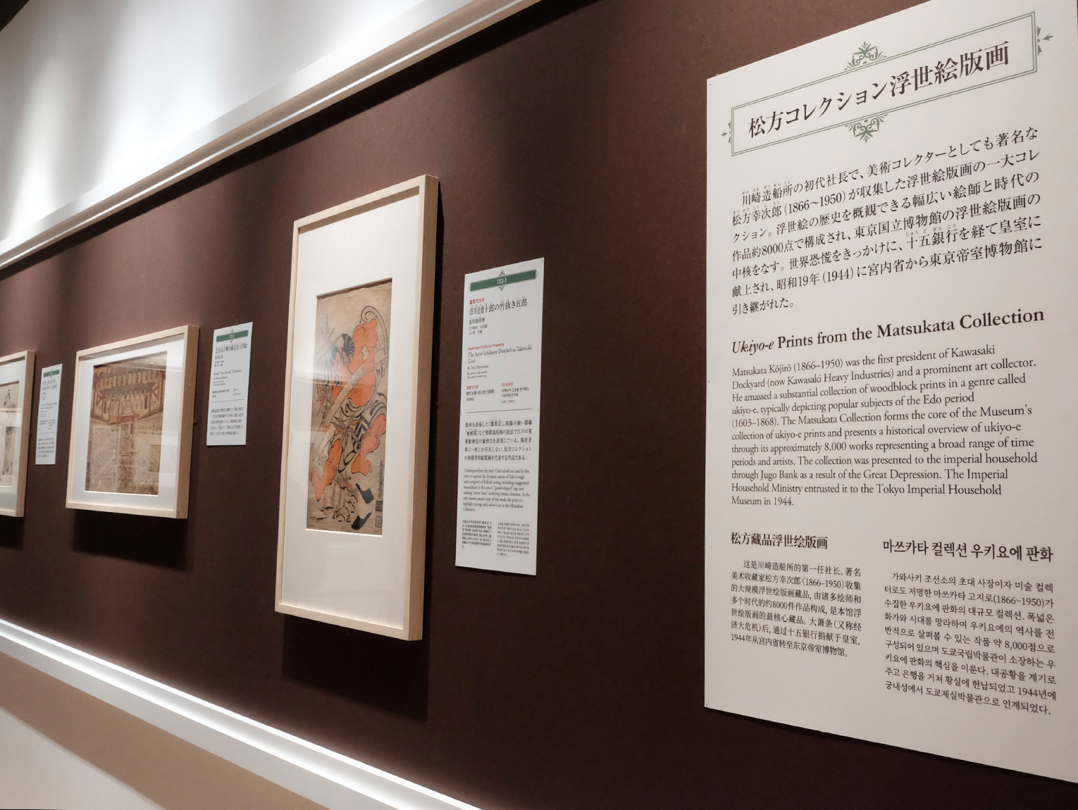 さて前置きが長くなりましたが、開催中の「国宝 東京国立博物館のすべて」展に展示されているのは、国宝だけではありません。展覧会の会場は二部構成になっていて、すべての展示品が国宝という贅沢な第一部の展示室の後には、さまざまな作品や資料を通じて博物館の150年の歩みを紹介する第二部が続きます。この第二部の展示室に、東京国立博物館が所蔵する浮世絵の名品が展示されているんです。