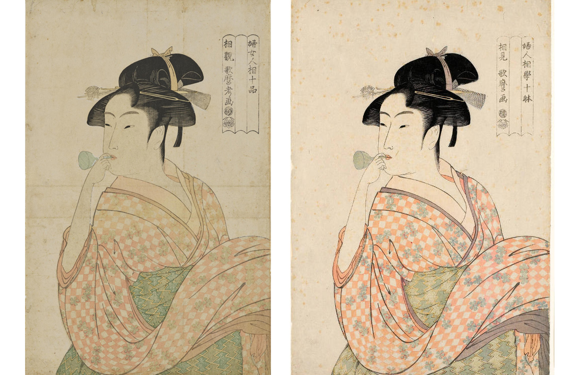 伝統の木版技術を継承する職人たちを擁する現代の版元「アダチ版画研究所」では、この蔦屋版の背景に用いられた「雲母」は、バレンで摺ったものではなく、型紙を用いて、膠に雲母を混ぜた絵具を刷毛で引いたものではないかと推測しています。同所がスポットライトの下で撮影した復刻版の「ポッピンを吹く娘」の輝きを見てみましょう。