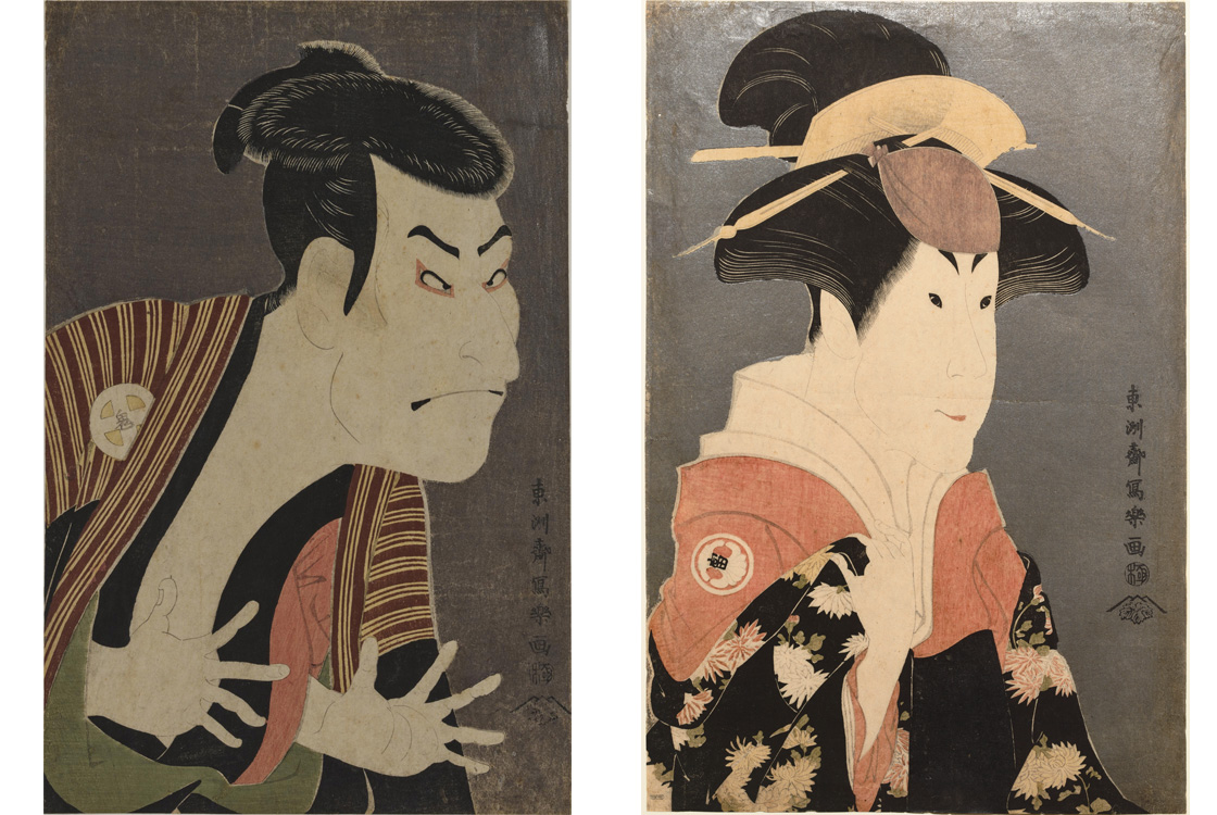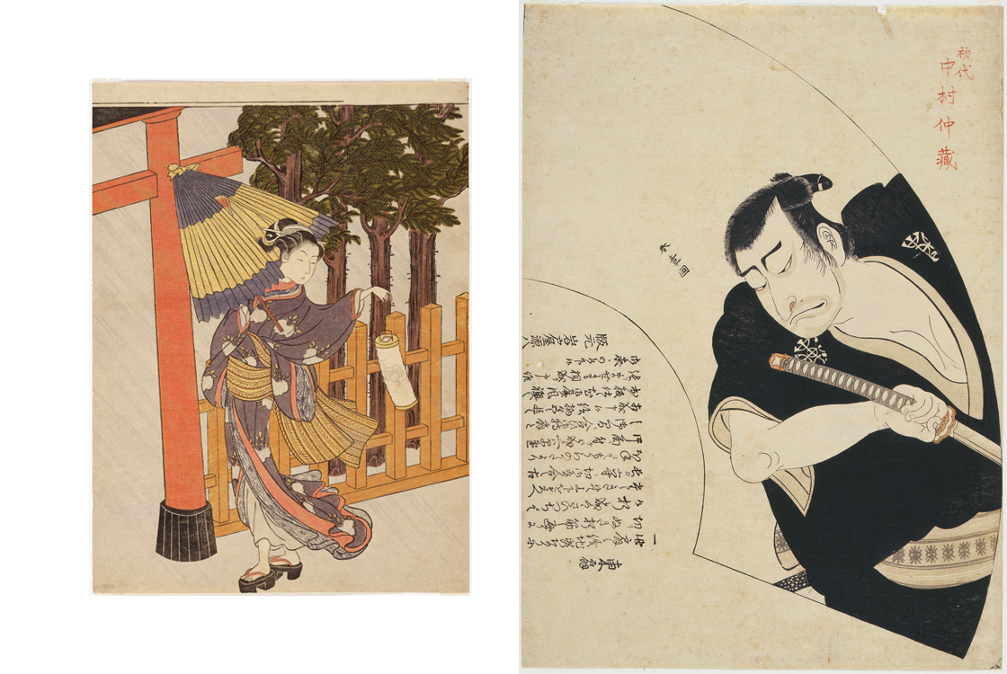 (左)鈴木春信「雨夜の宮詣(見立蟻通図)」(右)勝川春章「東扇・初代中村仲蔵」ともに東京国立博物館蔵
