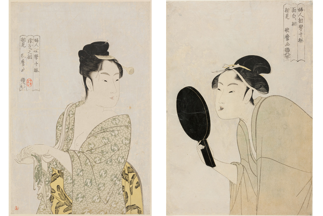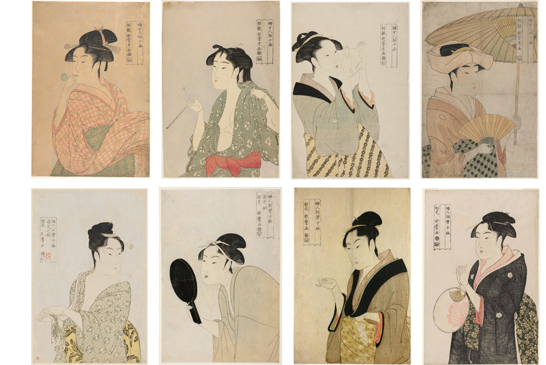 「十品」「十躰」という言葉から、「婦女人相十品(ふじょにんそうじっぽん)」と「婦人相学十躰(ふじんそうがくじってい)」は、ともに歌麿の美人画の10図揃いのシリーズ名という風に考えられます。現在、「婦女人相十品」という文字が入った作品が他に3図、「婦人相学十躰」という文字が入った作品が他に4図確認されています。