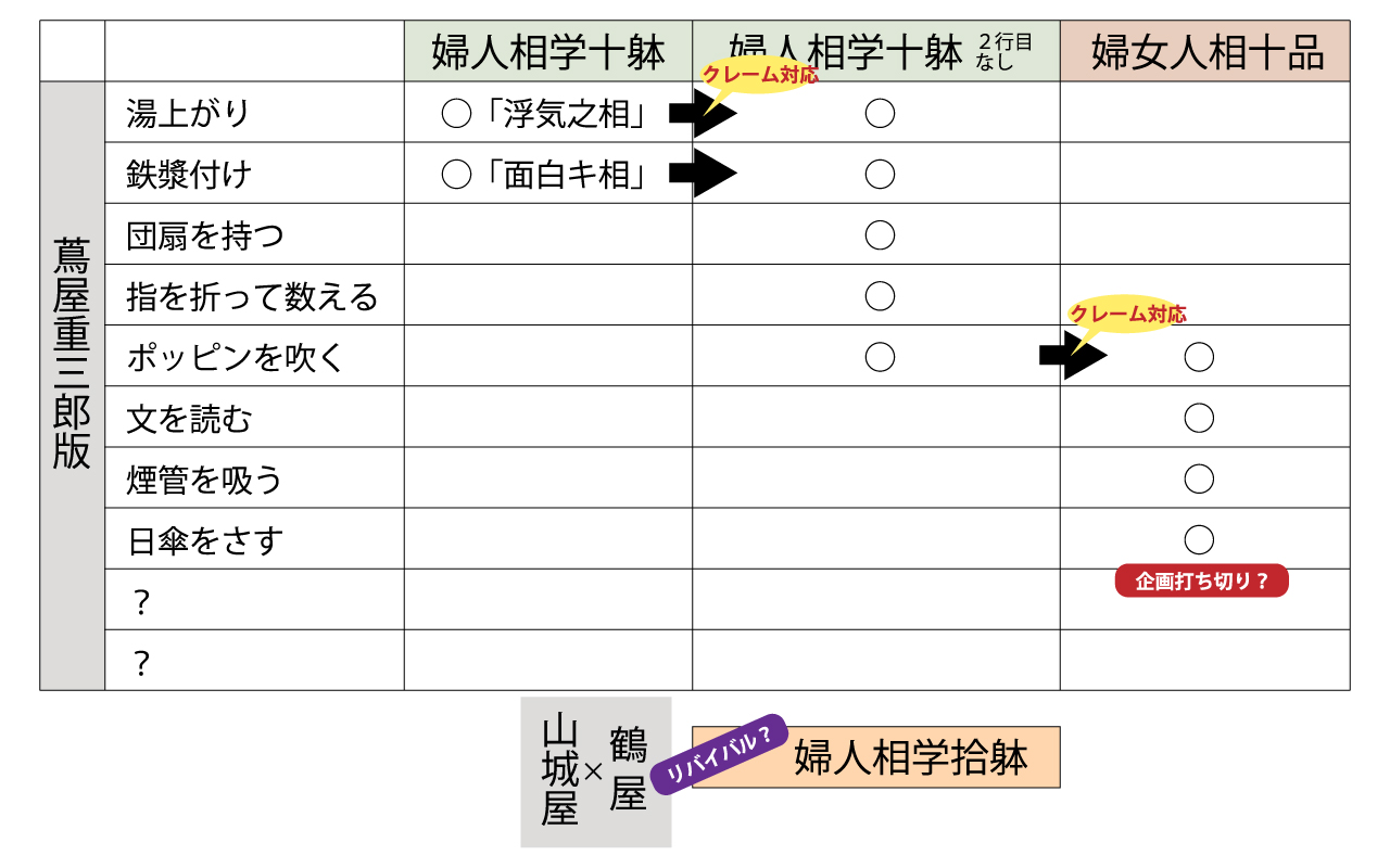そして、この2図それぞれに「浮気之相」「面白キ相」の文字が無い作品も確認されていることから、まずこの2図を出版してまもなく三連枠の2行目の「◯◯(の)相」という表記が、なんらかの事情で使用できなくなり、残りの作品も含めて2行目の文字を消して出版した(この場合は、版木を削ればOK)ものの、さらに1・3行目の文字も変更を余儀なくされた、という風に考えられたのです。「浮気之相」と「面白キ相」がともに「十躰」のシリーズ名であることから、「十躰」が先に出版されたものだろうと考えられます。