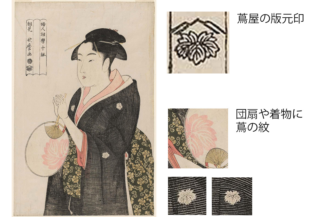 東京国立博物館の所蔵品には「婦女人相十品/相観 歌麿考画」、ホノルル美術館の所蔵品には「婦人相学十躰/相見 歌麿画」と書いてあります。どちらも、女性のさまざまな人相を十種揃えた趣向を伝え、絵師である歌麿が、その相を見て描きました、というような具合ですが……。ちなみに、歌麿の名前の下にある丸印は検閲を受けたことを示す極印で、その下の葉っぱのマークは、版元の蔦屋重三郎の印です。