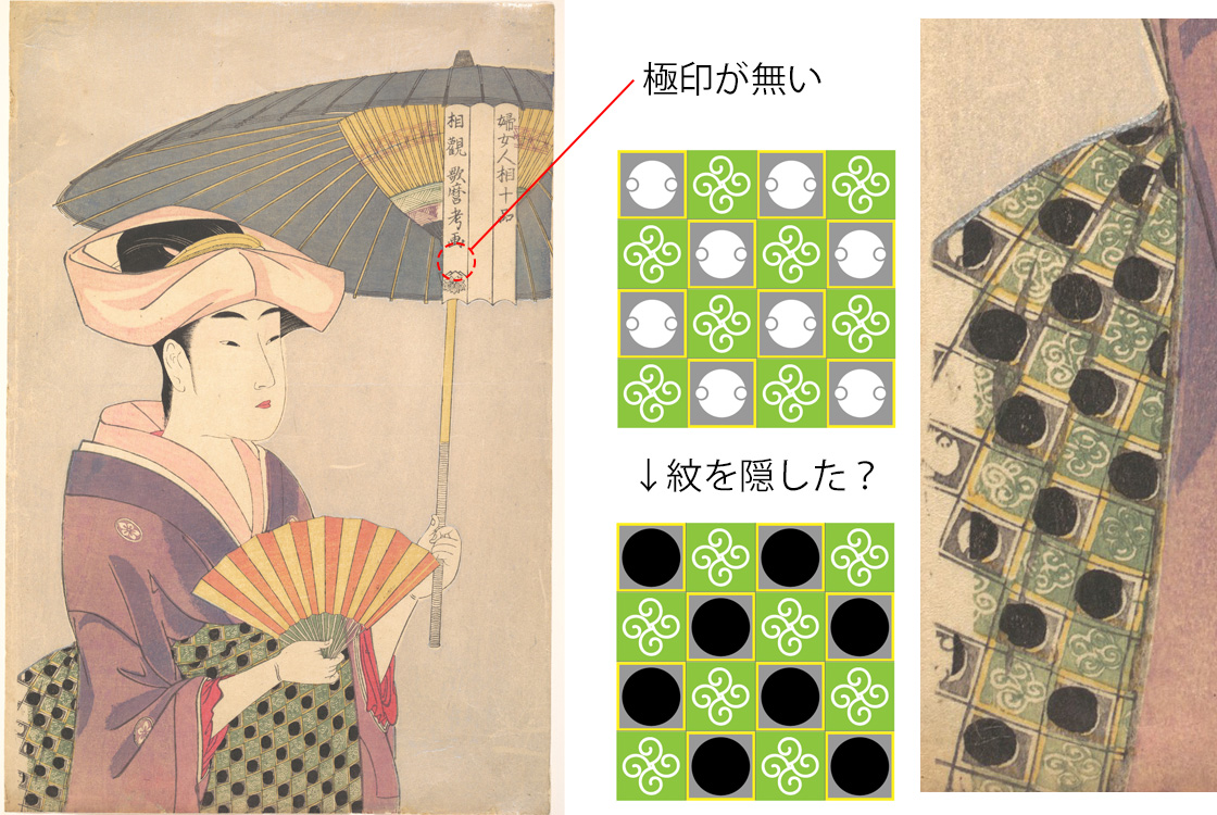 また、この図のみ極印が捺されておらず、メトロポリタン美術館の所蔵品からは、帯の格子の中の模様は、もともとは子持ち分銅紋で、上からそれを隠すように円形の墨の版が加えられているようなことも確認できます。これらのことが意味することとは一体……?