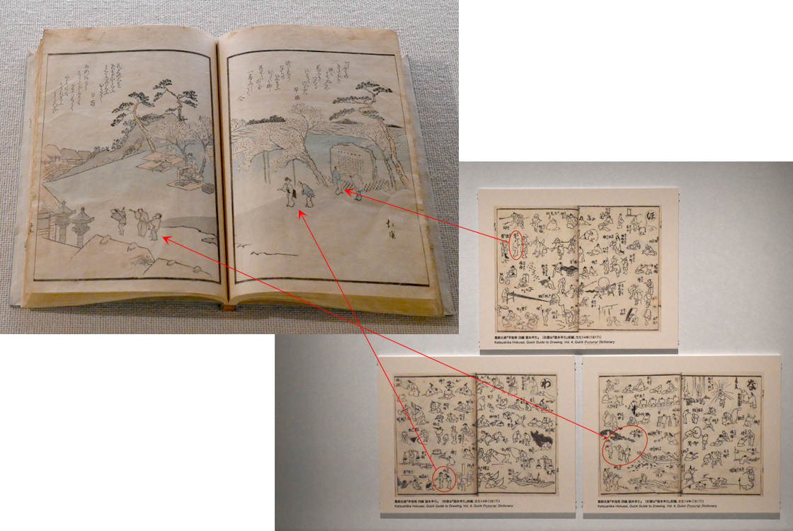 北斎の弟子、魚屋北渓が描いた風景には、北斎の『画本早引』二編に描かれた人々が散りばめられている。