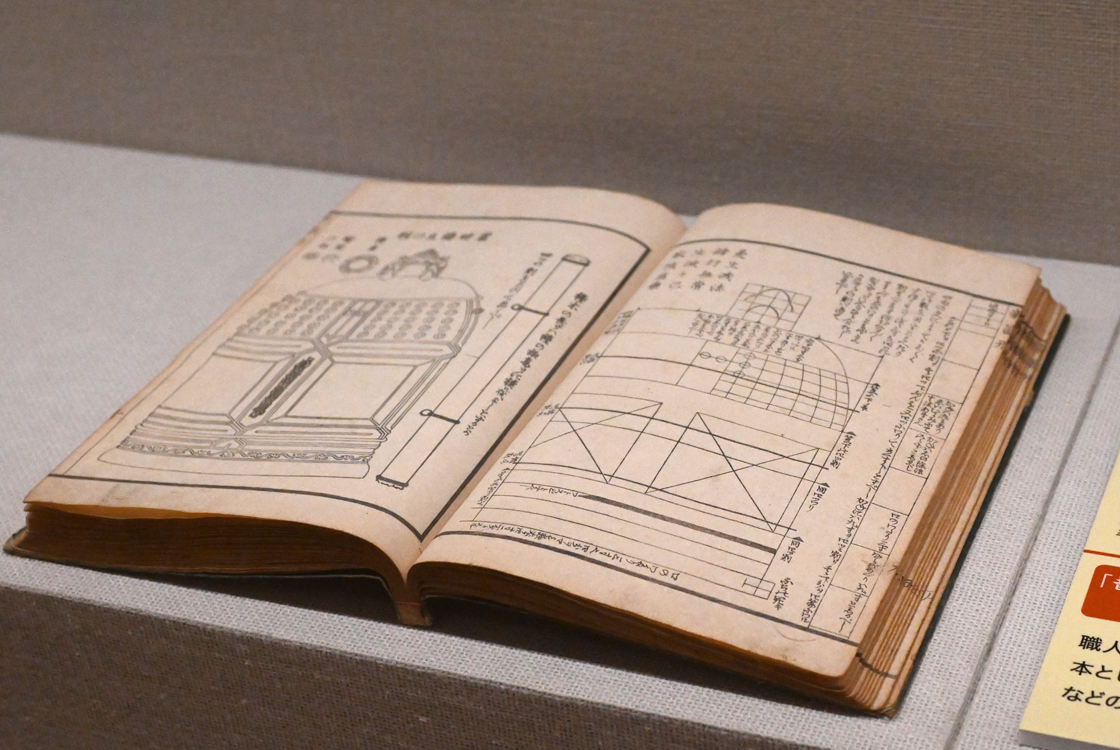 定規やコンパス(ぶんまわし)を用いた設計図のような鐘の図。神社・仏閣の建築の描き方を示した『諸職絵本 新鄙形』。