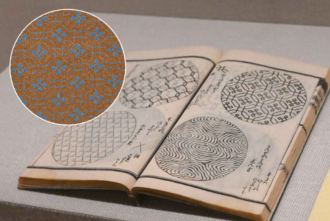 北斎が考案した小紋の柄が描かれている『新形小紋帳』。展示室には、その小紋を再現した着物も展示されている。
