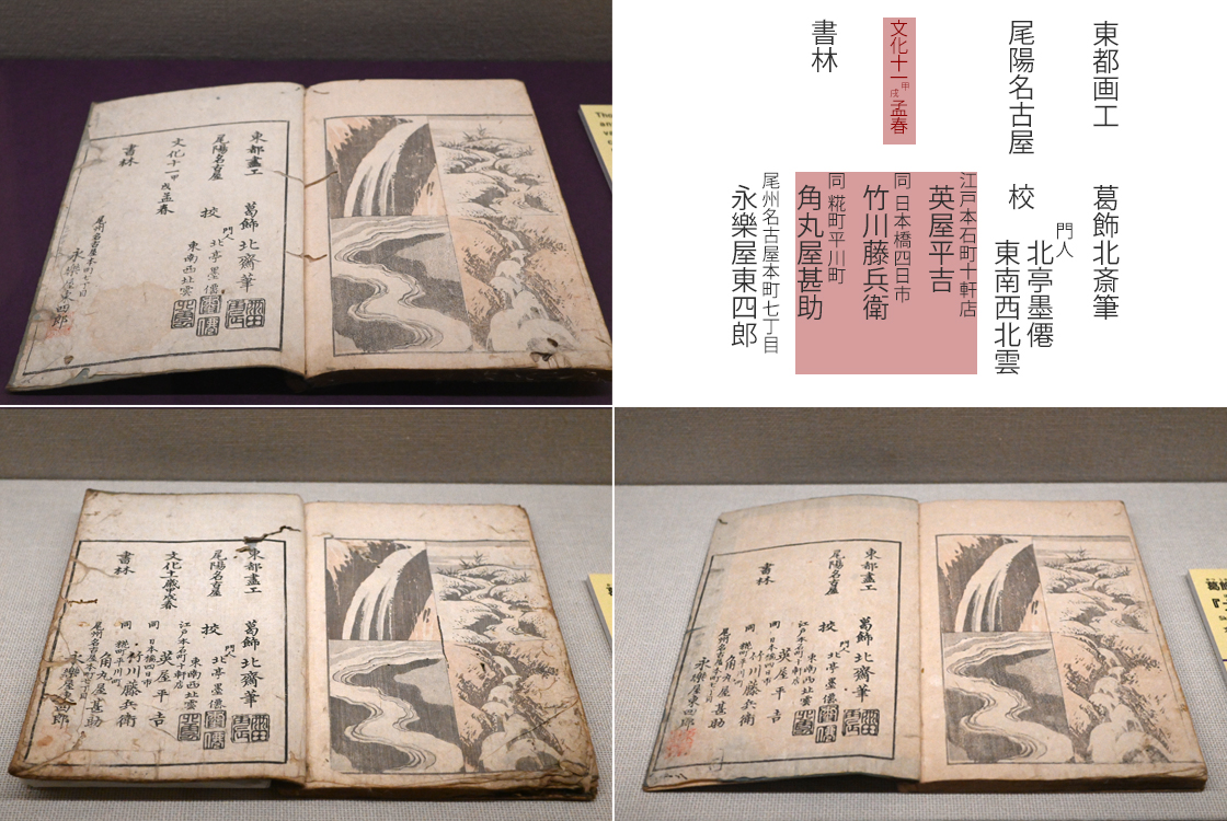 大好評だった『北斎漫画』は各編増刷を重ね、摺りの違いなど複数のバリエーションが生まれました。会場では、奥付情報の相違などを比較できるよう、同じ巻の『北斎漫画』を複数並べたりもしています。