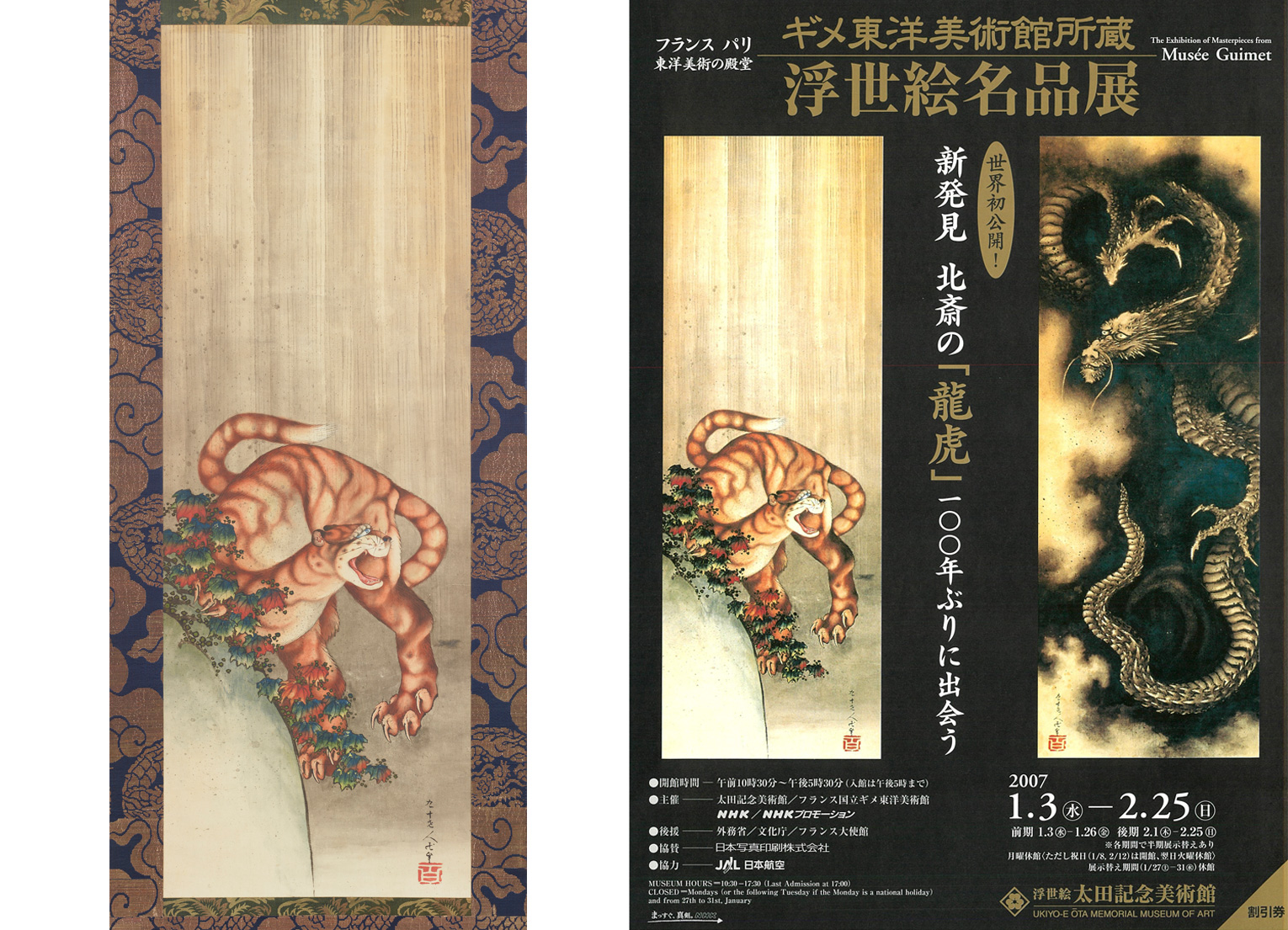 2図の掛け軸の表装はまったく同じ物で、画寸法もほぼ同じ。落款(サインの部分)も酷似していて同時期に描いたものと考えられました。そして両作を並べて壁に掛けると、虎と龍の視線はしっかり交じりあったのでした。およそ100年ぶりとなる再会を果たしたフランスの「龍図」と日本の「虎図」は、2007年に開催された「特別展 ギメ東洋美術館所蔵 浮世絵名品展」に共に出品されました。