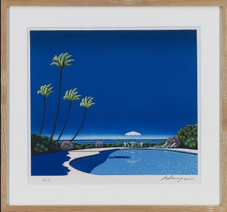 どこまでも続く青い空と海。日射しの降り注ぐプールサイド。今も聴き継がれる日本ポップス史上の名盤、大瀧詠一の「A LONG VACATION」ジャケットに代表されるレコードやCDジャケットを始め、ポスターや広告など様々なシーンを彩ってきた人気イラストレーター・永井博氏。その代表作「Time goes by...」が、このたびアダチ版画研究所の摺師と彫師によって木版画作品として完成しました。木版ならではの和紙の風合いや、伝統木版が得意とする“ぼかし”の技術を駆使して表現された透明感に溢れた青い空など、他の版種とは異なる木版ならではの魅力がつまった作品です。