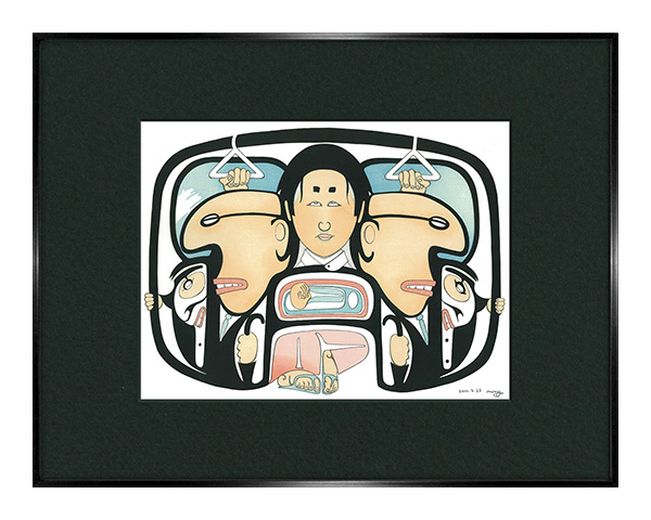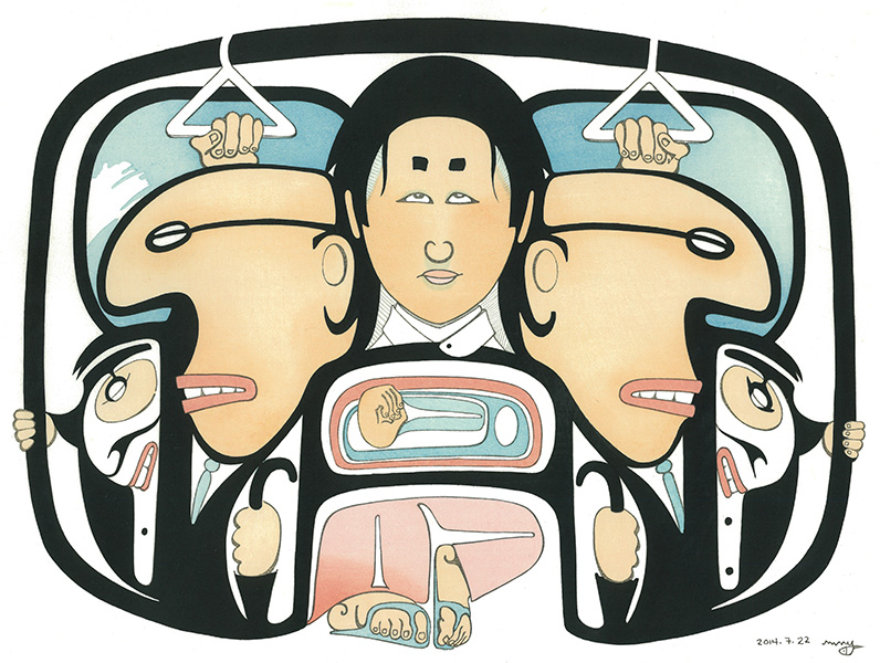 カナダ先住民族ハイダ族の伝統的な手法で描かれる装飾的な輪郭線の中に、満員電車の風景を描いた本図は、左右対称に描かれたサラリーマンの画一的な姿や能面のような表情といった要素に現代社会への鋭い風刺がこめられています。