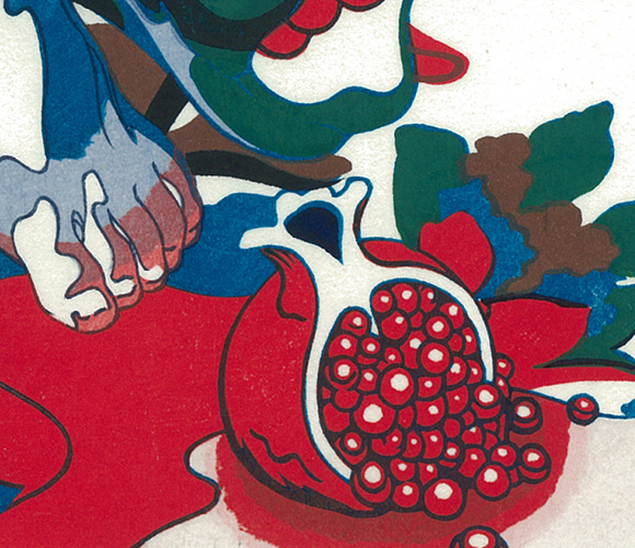 タイトルの「Pomegranate」は、ザクロのこと。本図に描かれたザクロからしたたる紅色で化粧をする女性は、ザクロの持つ豊穣や子孫繁栄といった強い生命力・存在感を身にまとおうとしているようにも見えます。木版画特有の鮮やかな発色を生かした、色彩のコントラストが鮮烈な作品です。